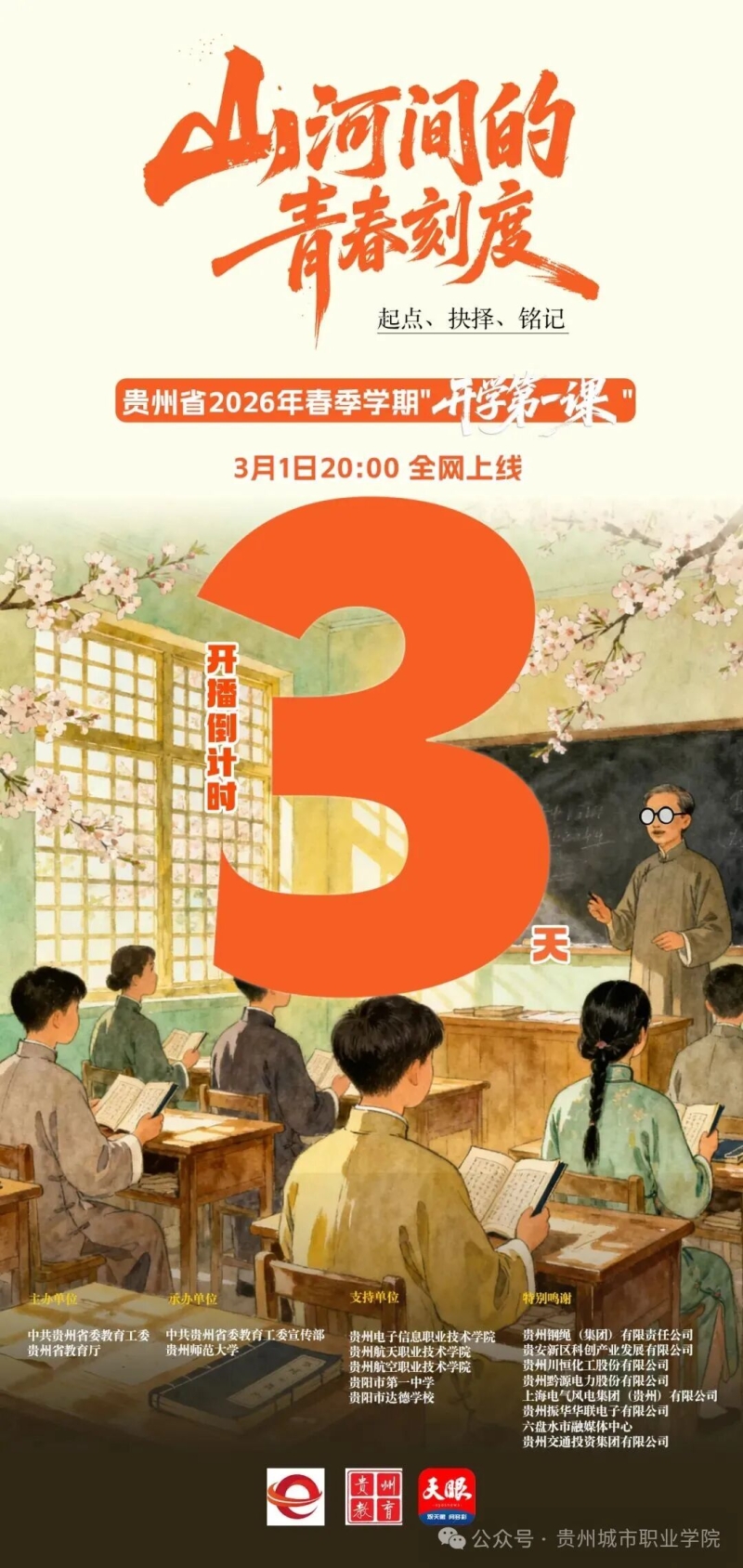 由中共贵州省委教育工委、贵州省教育厅精心策划的贵州省2026年春季学期“开学第一课”——《山河间的青春刻度》,将于3月1日晚20:00上线。