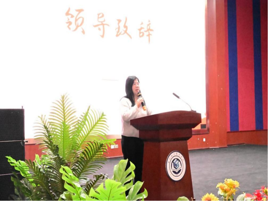 图1:商旅学院党总支书记刘玲登台致辞,为师生寄语嘱托