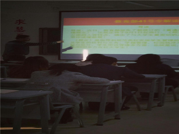 2017年3月22号下午,商务学院全体辅导员参加学生处在多媒体教室414组织的辅导员培训,姜宽处长及徐高峰主讲。主要培训内容有以下几点:违纪违规处理、辅导员班主任考核、带班津贴分配标准、班主任手册填写、休学、退学、请假办理要求、晚自习主题班会要求、档案填写、学生证办理、磁卡办理流程要求、奖助贷办理相关要求、评优、评奖要求、教育部41号文件解读。